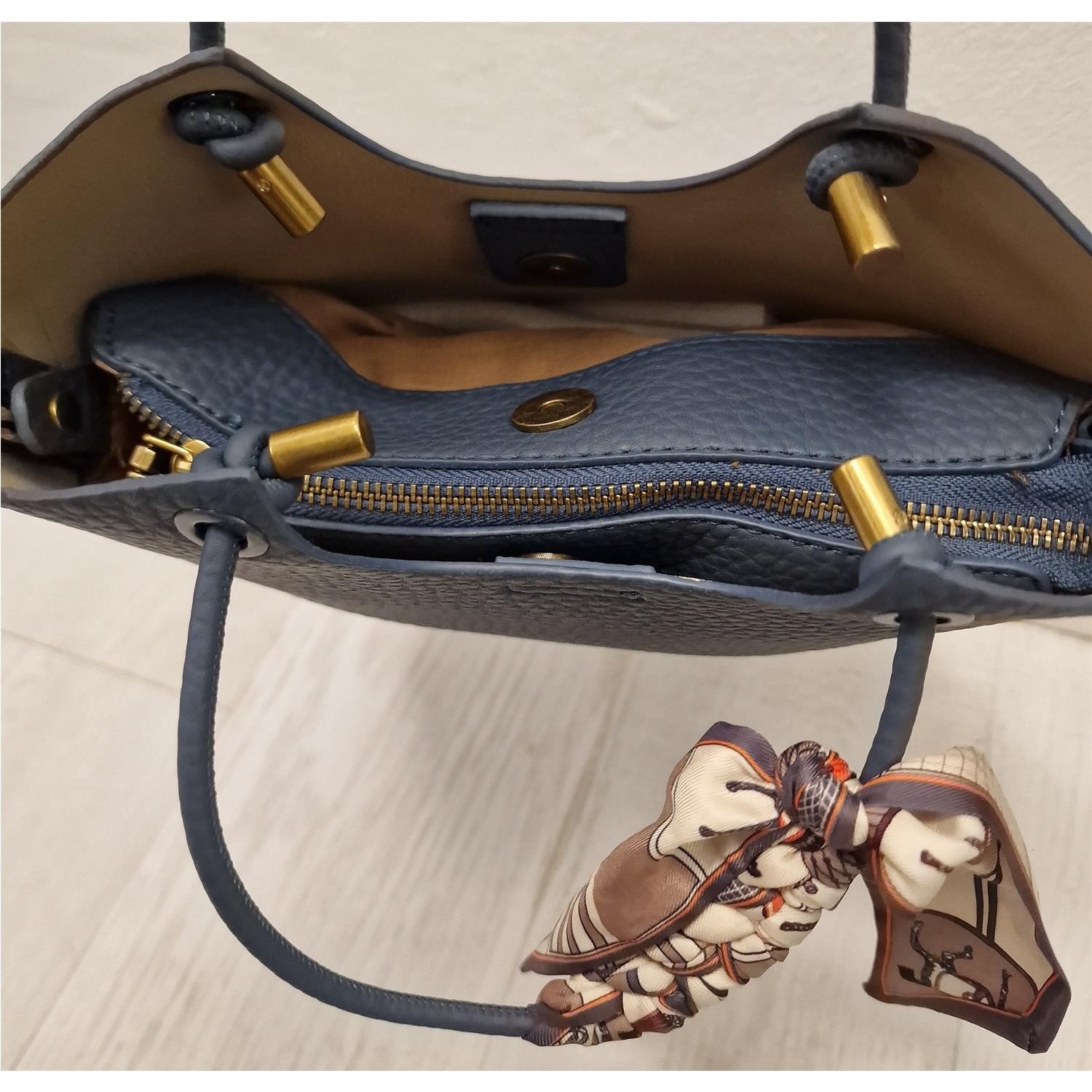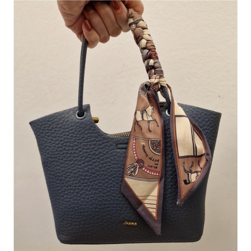Boloso pequeñio decorado una de las asas con un pañuelo estampado de raso. En el interior tien eun bolsito pequeño de loneta con cremallera para poder llevar más comodamente tus objetos. Viene con un asa larga para pocer llevarlo como bandolera.